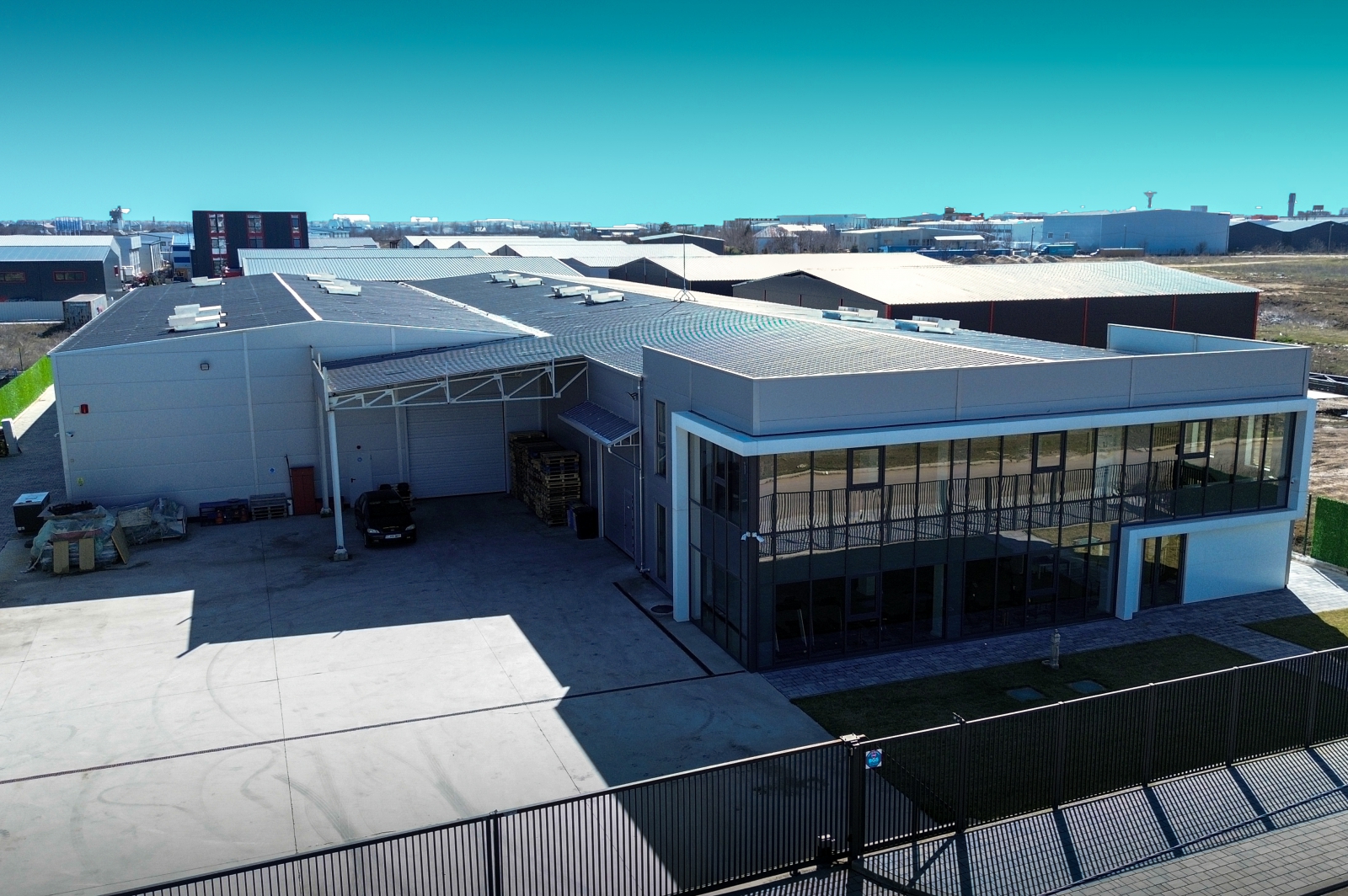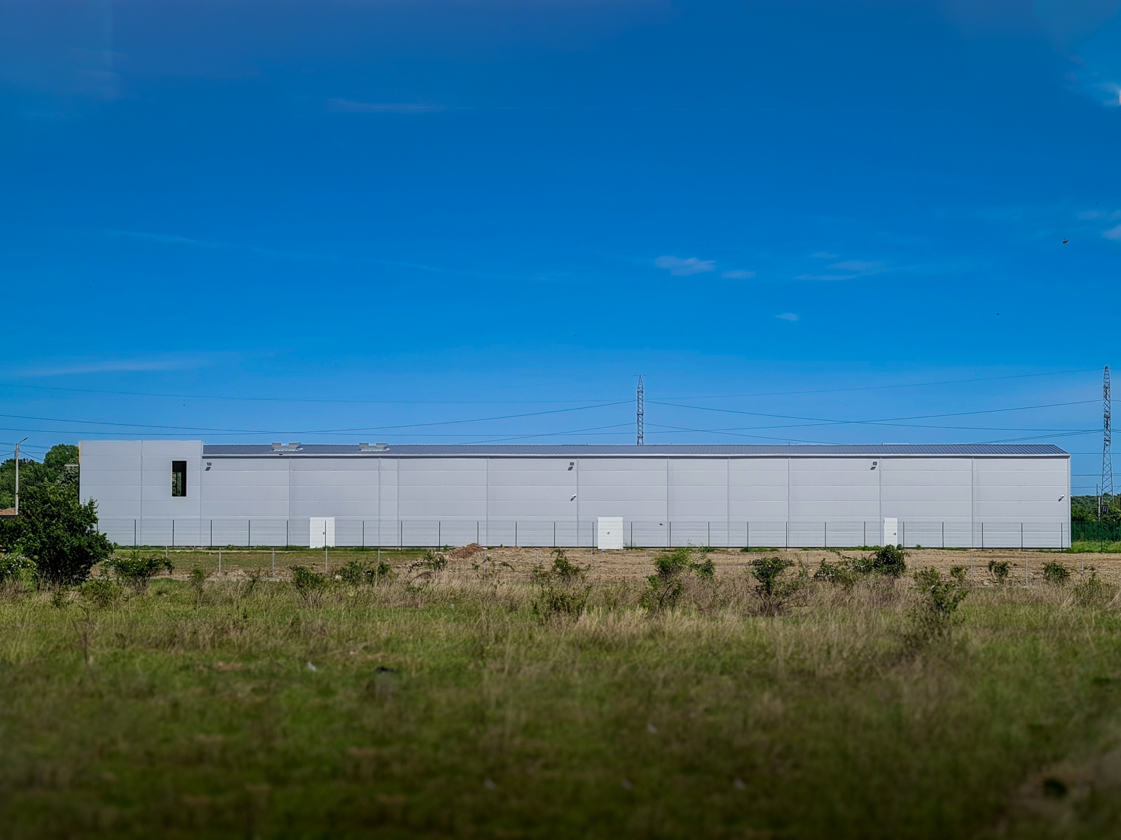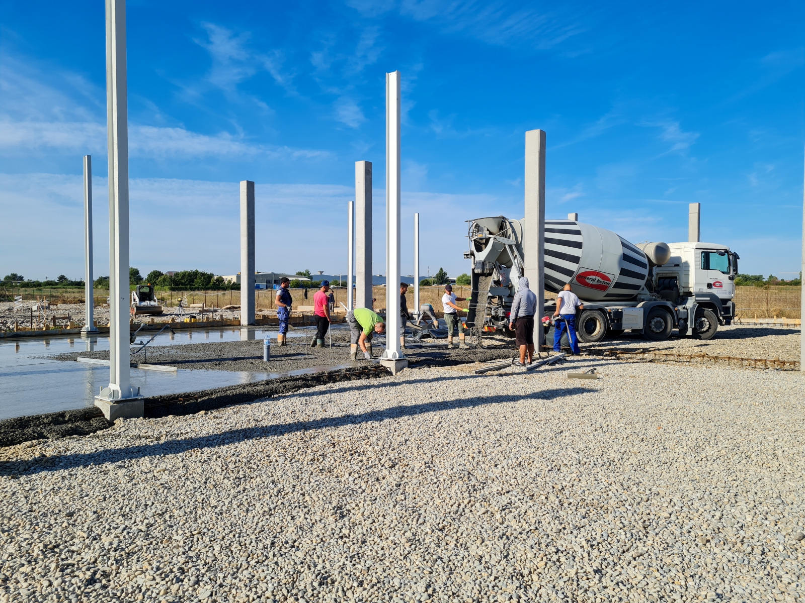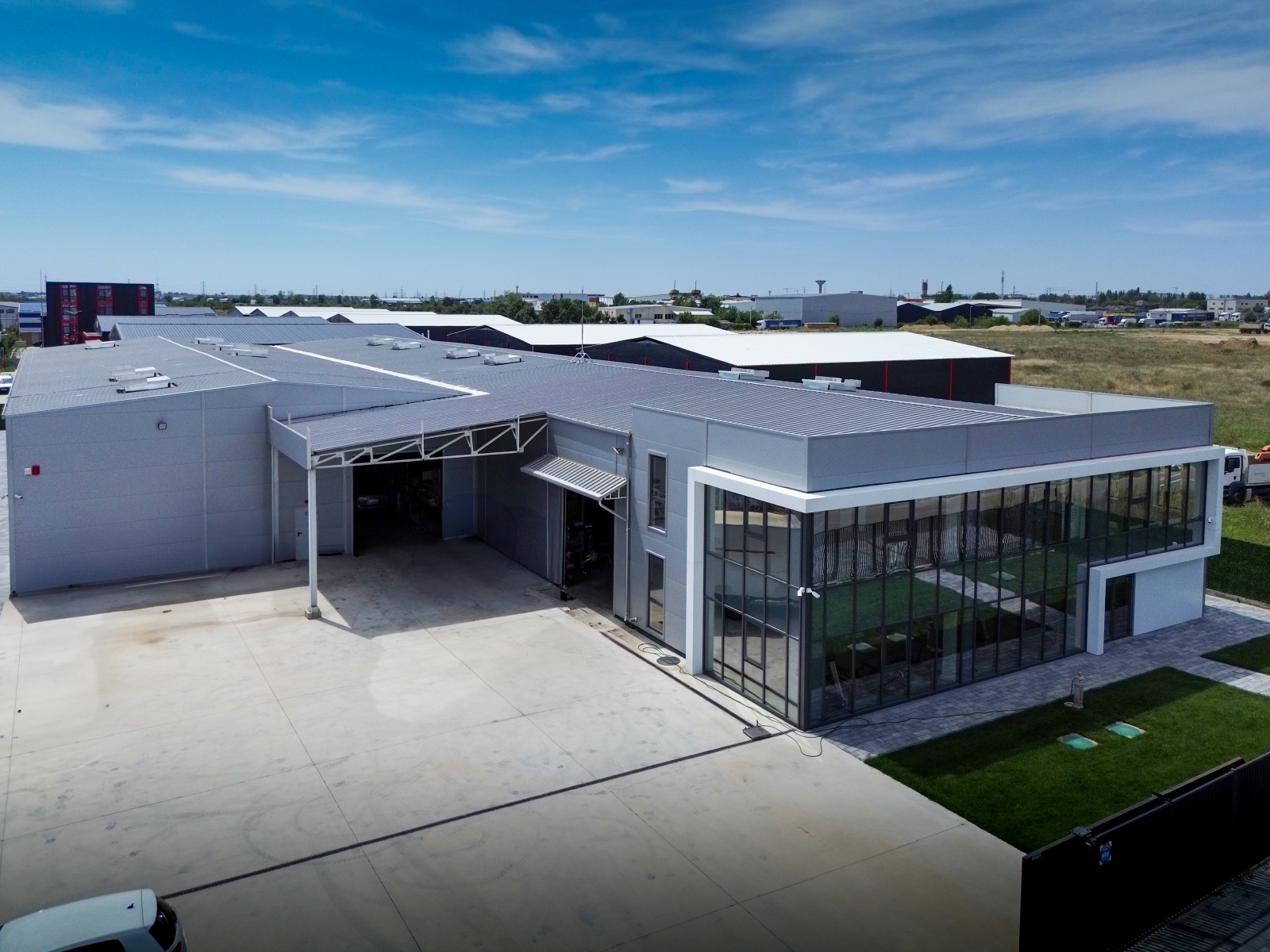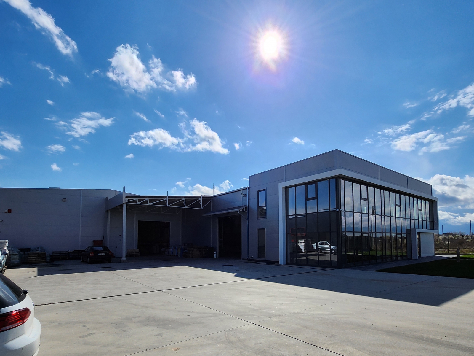 Hală industrială cu spațiu de depozitare și zonă de birouri în partea frontală. Construcție pe structură mixtă, cu stâlpi prefabricați de beton și ferme metalice, potrivită pentru activități logistice și administrative.